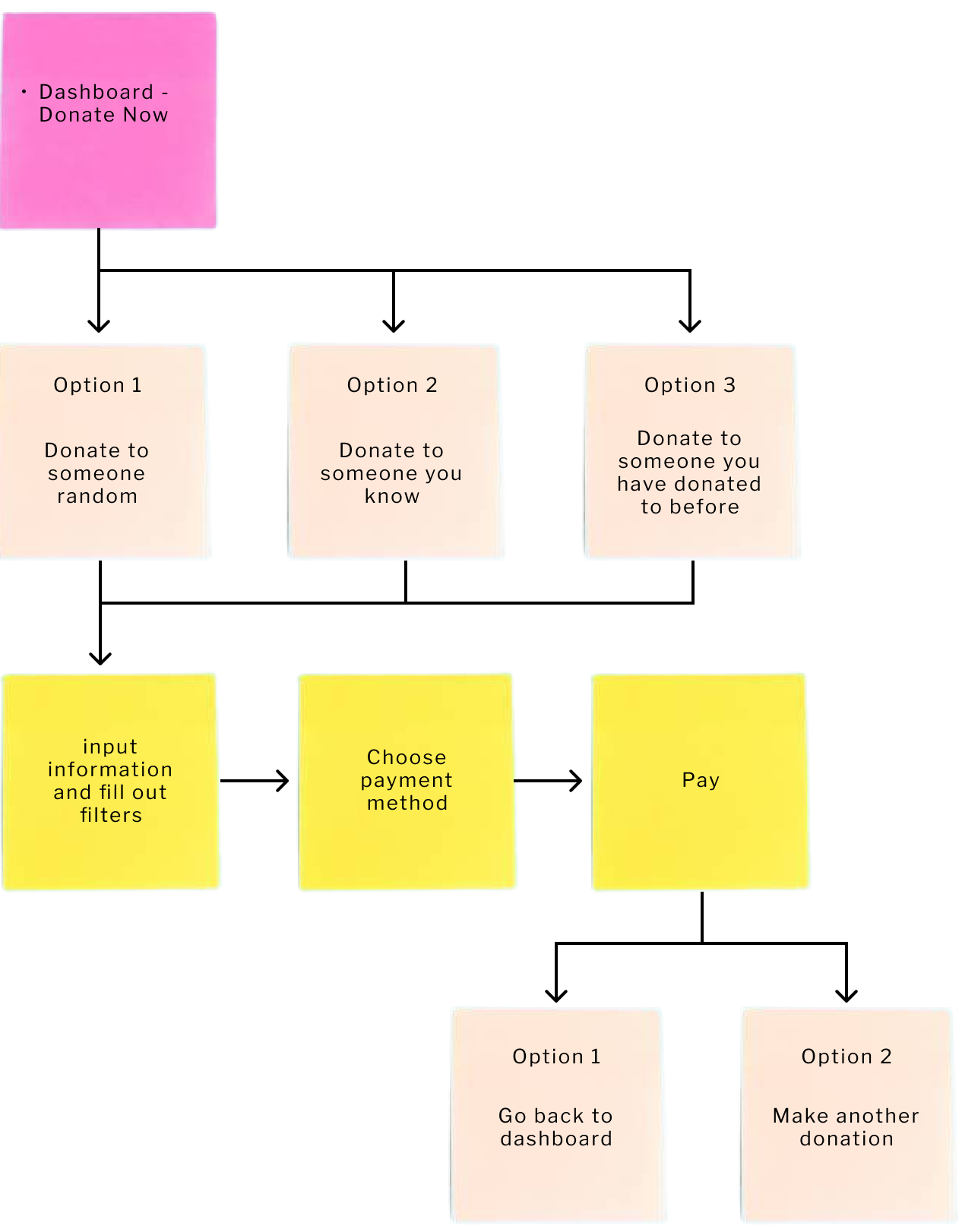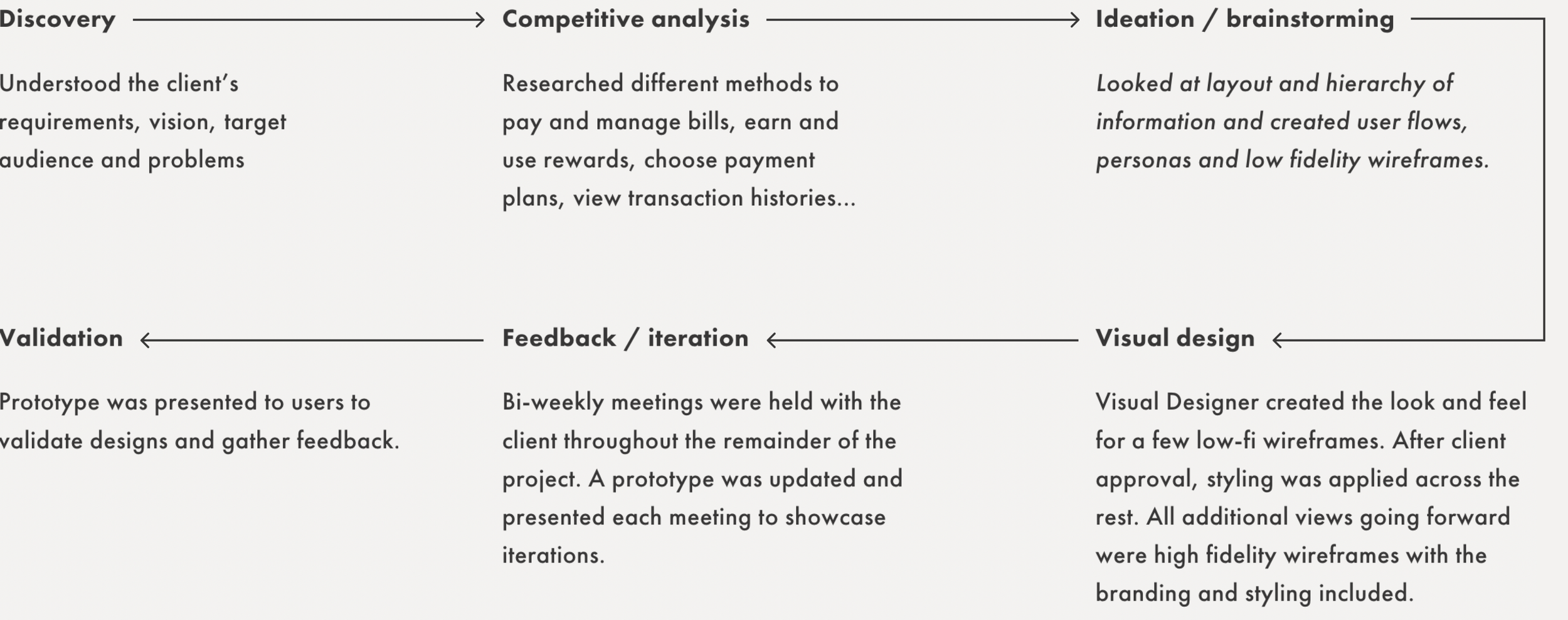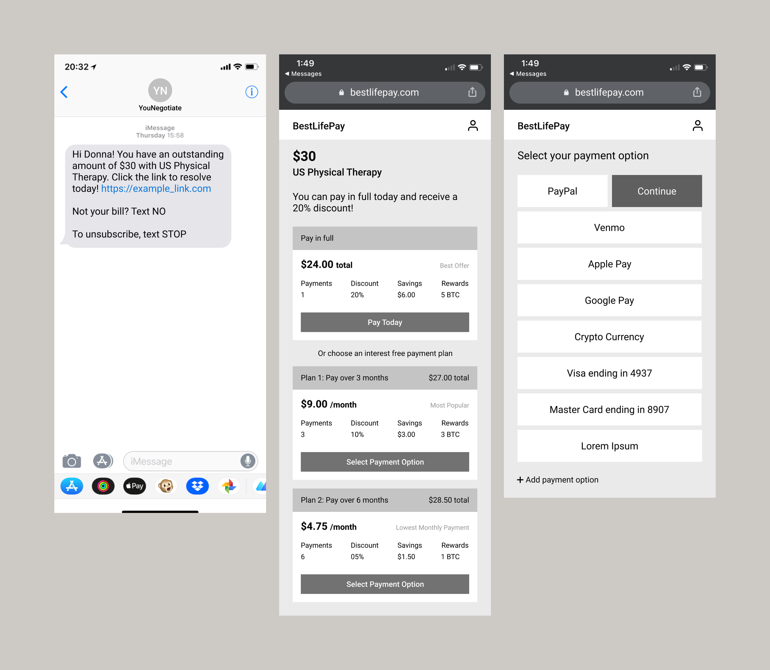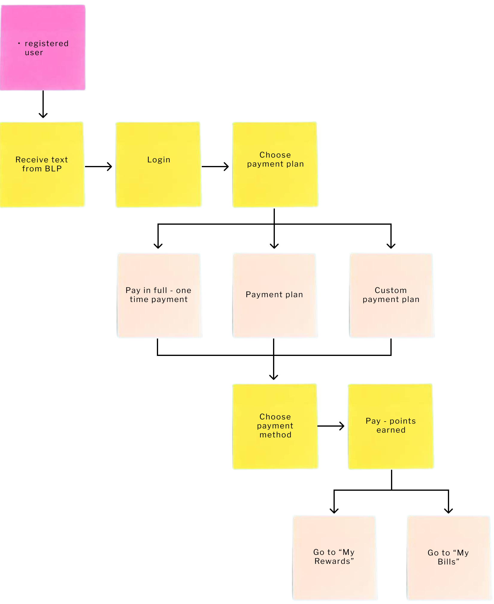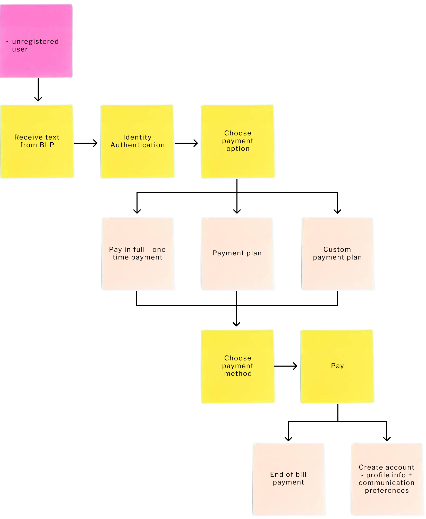 I started off with a simple flow: The user receives a text stating their bill is ready. They see the landing page with options to choose from and they can pick their preferred payment method.